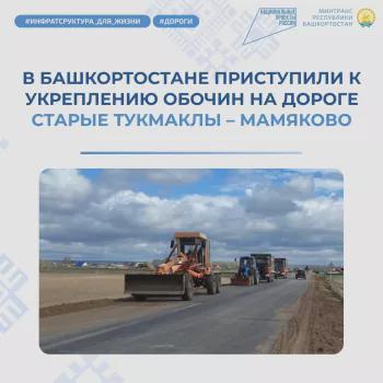 В Кушнаренковском районе Башкортостана начались работы по укреплению обочин на дороге Старые Тукмаклы – Мамяково. Ремонт участка длиной 3,2 км ведется в рамках нацпроекта «Инфраструктура для жизни».