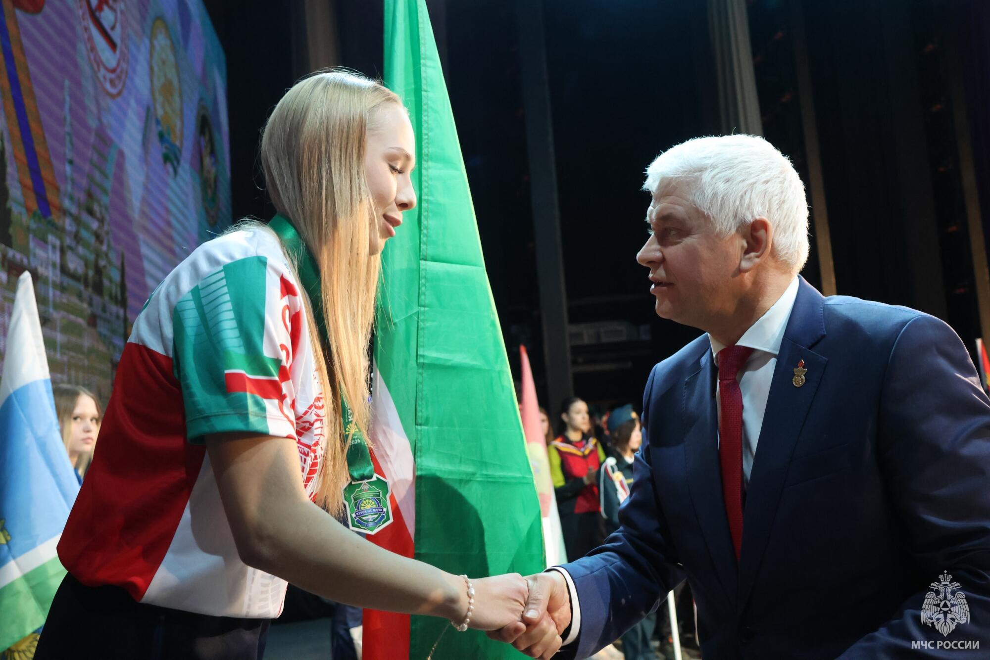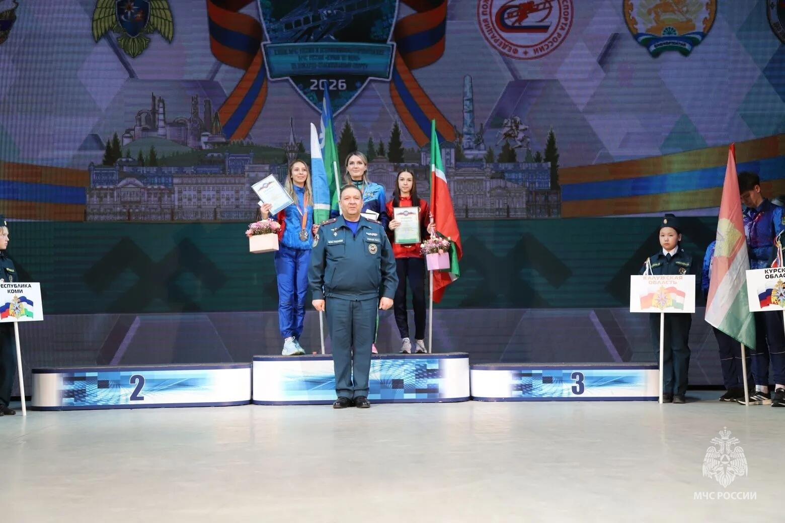 Призёров среди девушек средней возрастной группы наградил президент Федерации пожарно-спасательного спорта России Сергей Кудинов: